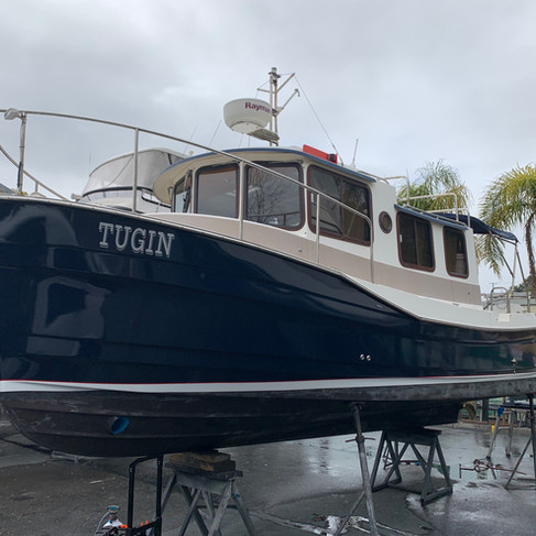 Vinyl Boat Wrap - Ranger Tug R-25 in Boat Blue with new boat name and stripe